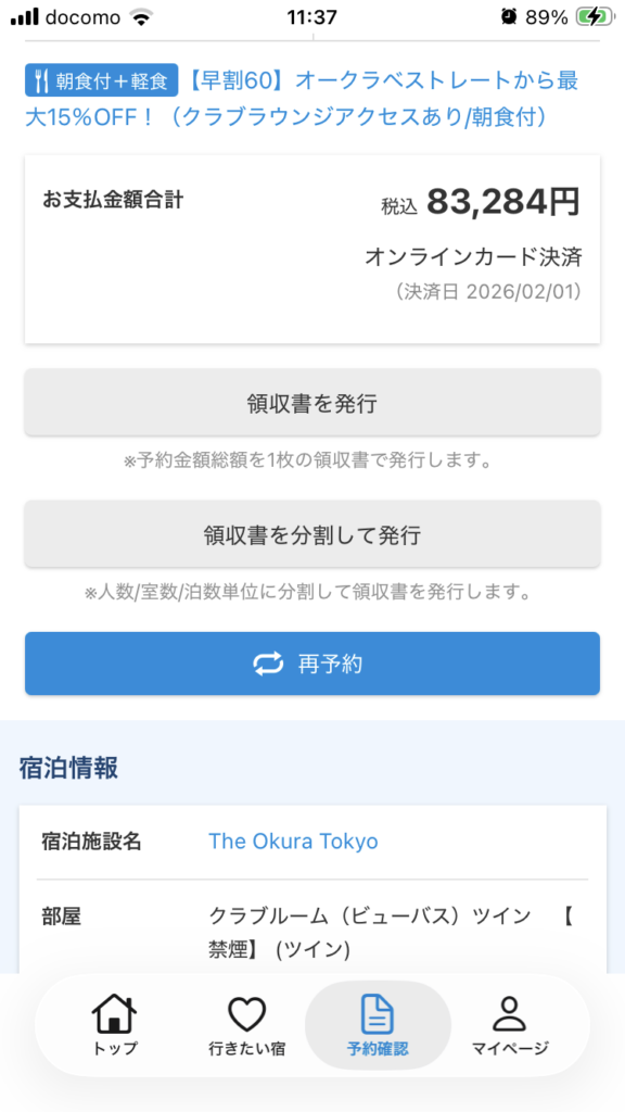 今回のお宿泊料金 1泊朝食付き プレステージタワー クラブルームツイン 2名
