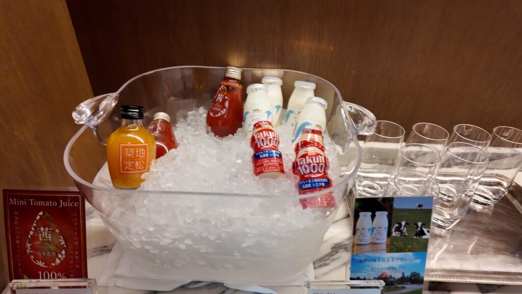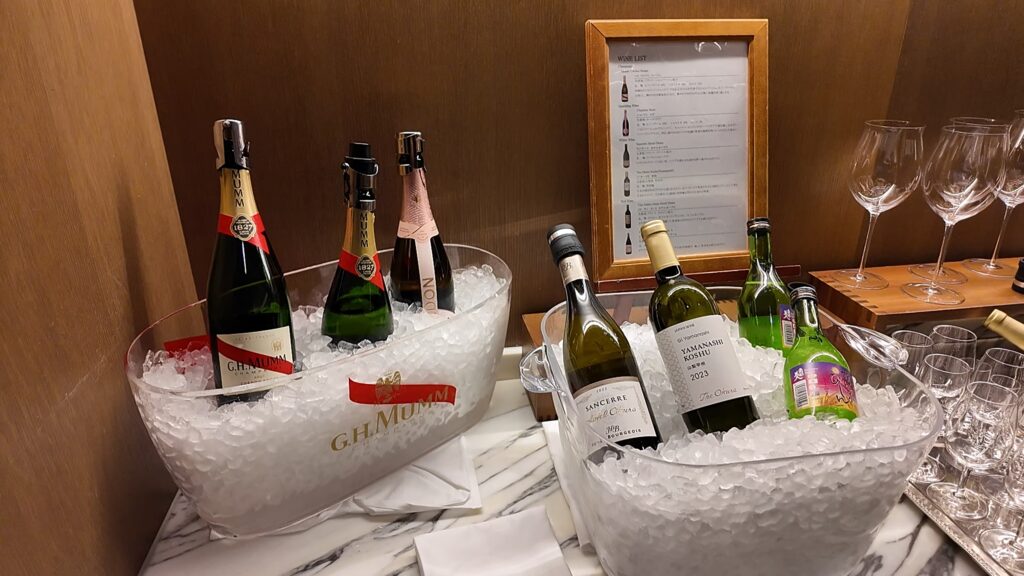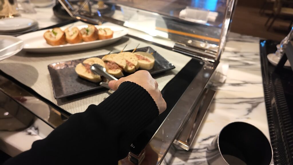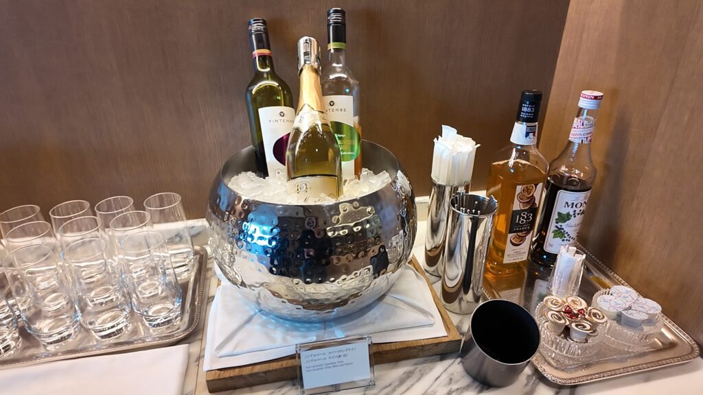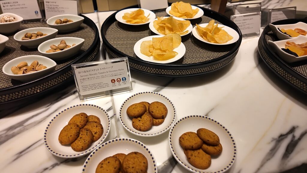 ラウンジのナイトキャップにはトリュフマカダミアナッツやイベリコ豚ポテチなど高級なお菓子が並んでいます。