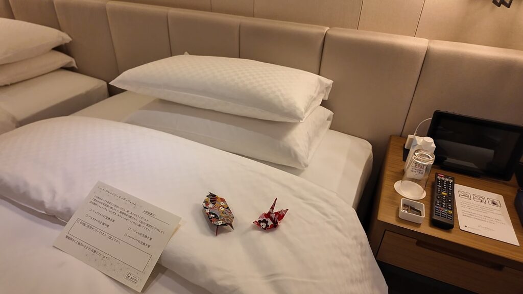ターンダウンサービスはベッド周りが整理されてお水とチョコレートが用意してあります。