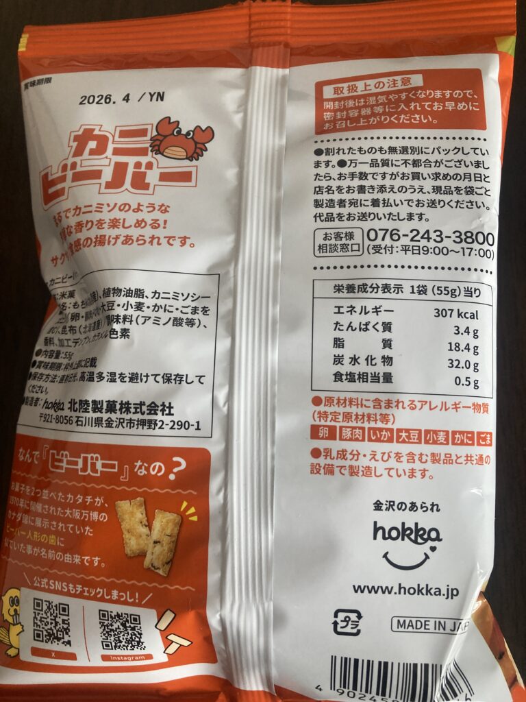 北陸・輪島で捕れたズワイガニエキスを使用しているのでお酒のアテに最適なお菓子です。