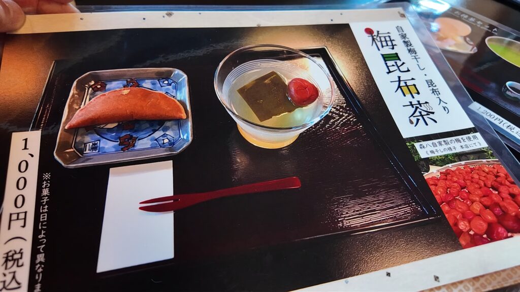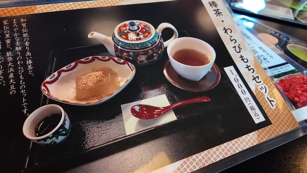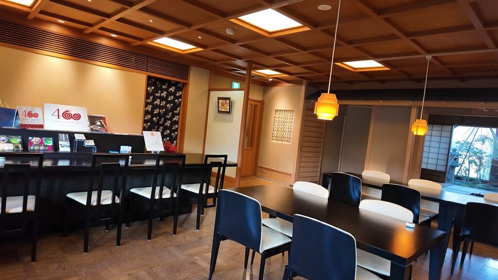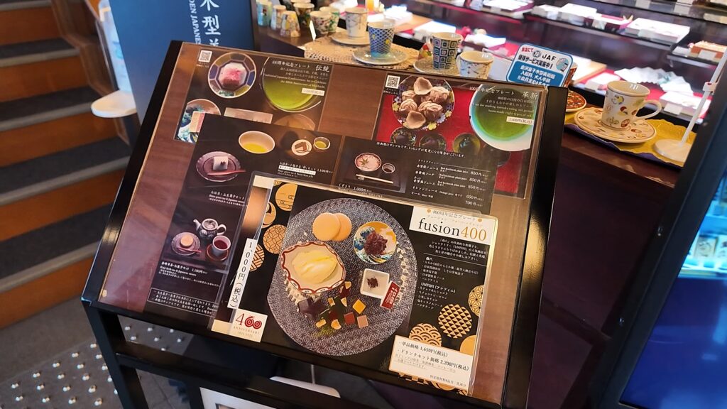1階はイートインスペースとショーケースには和菓子の販売があります。九谷焼の小皿やお箸なども販売しています。