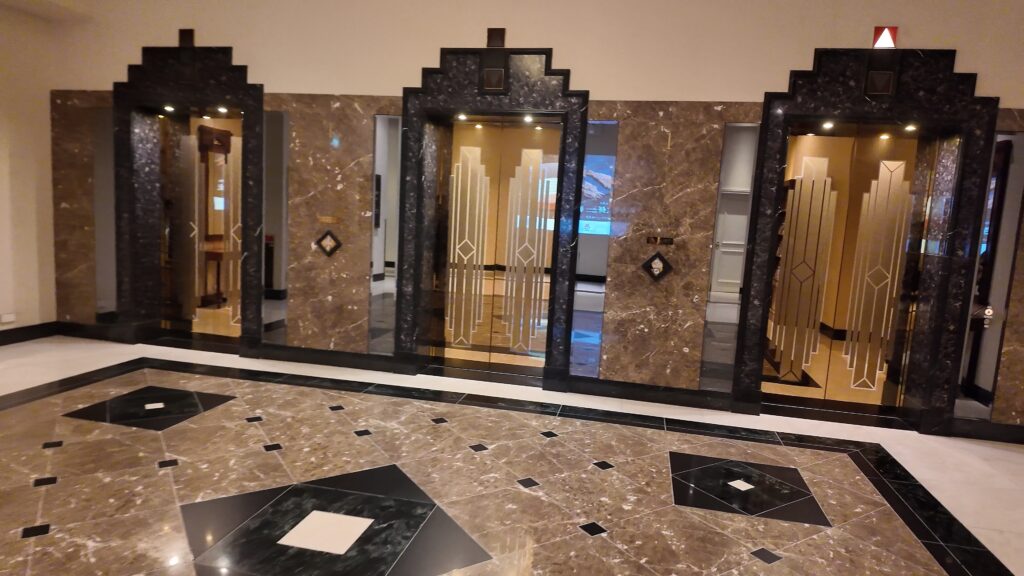 エレベーター内はゴールドな色使いでラグジュアリー感があります。