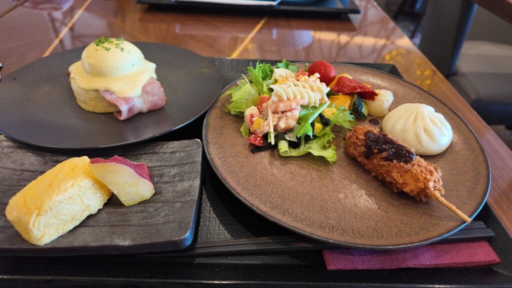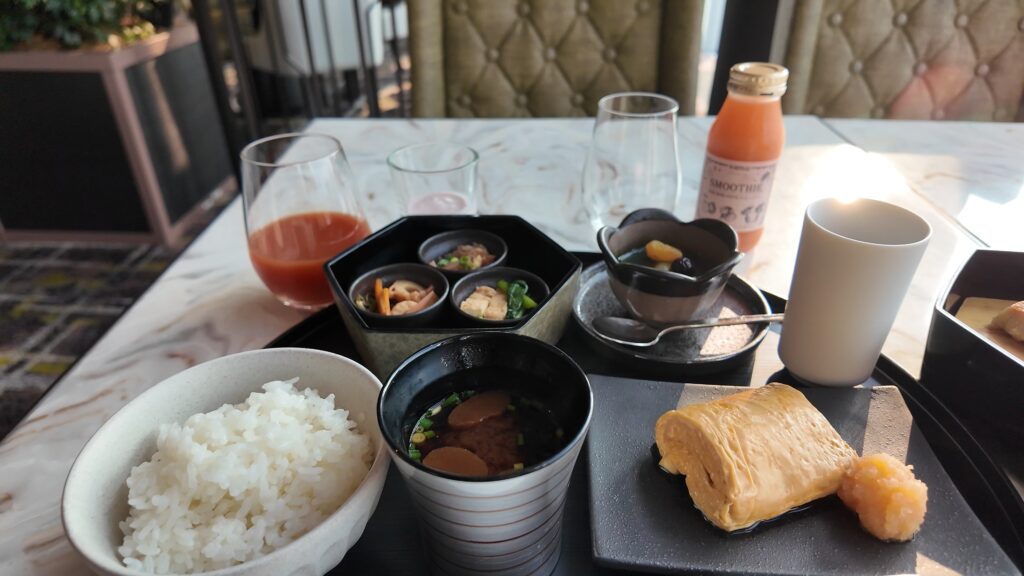 ラウンジの朝食は美味しいスムージーやヨーグルトがビュッフェ台に並んでいてそこに和食膳が運ばれてきます。ラウンジでしか味わえない絶品和食が堪能できます。勿論、ビールなどのアルコールも自由に飲めます。