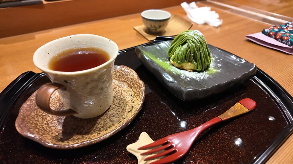 加賀の紅茶はスーッと飲みやすい馴染みのある和紅茶。抹茶モンブランは濃厚抹茶モンブランがすごく美味しいスイーツです。