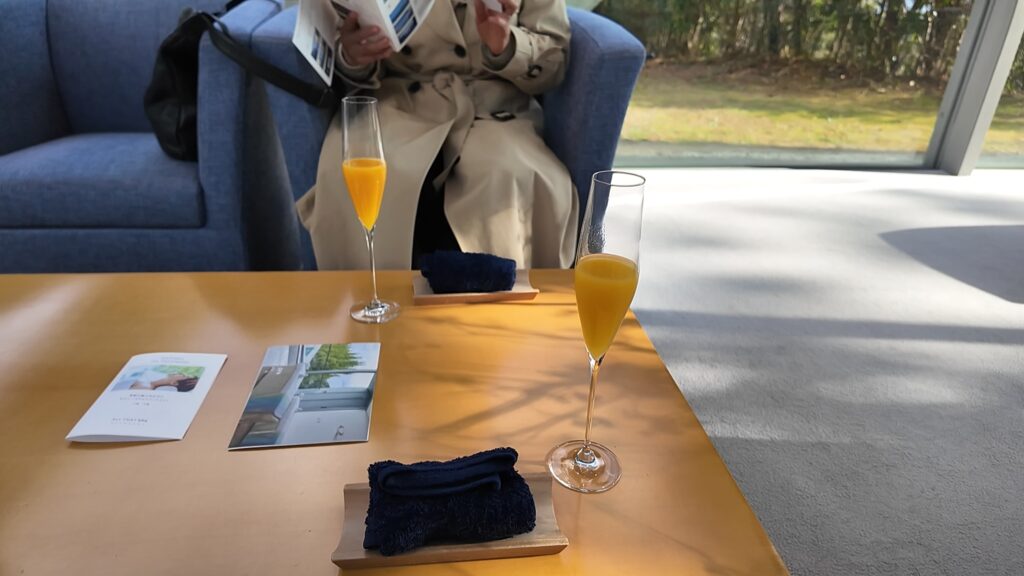 ウエルカムカクテルでお出迎えです。伊予柑ジュースかシャンパンかそれらを混ぜたカクテルにするかを選びます。コクがあり凄く美味しいです。