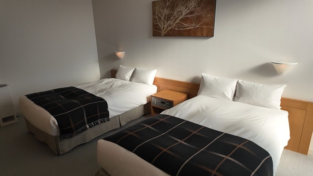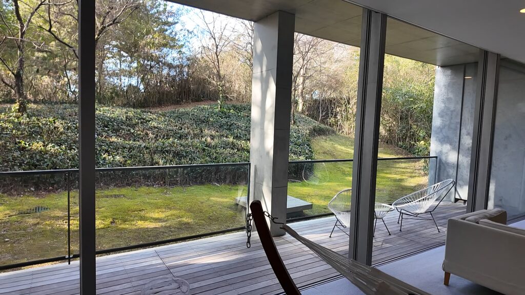 大きなガラス窓で美しい緑が映えます。建物がコンクリート造りなので冬は寒いかと思いきやお部屋は機密性が高いし床暖房も完備しています。共通部の通路などもヒーターの暖房器具が置いてあり真冬でも寒さの心配はありません。ウッドバルコニーが付いています。お部屋の冷蔵庫にはサイダーで有名な福山のクラフトサイダーが入っていたり地元のクラフトチョコレートがあったり他ではないものがあるのが良いです。