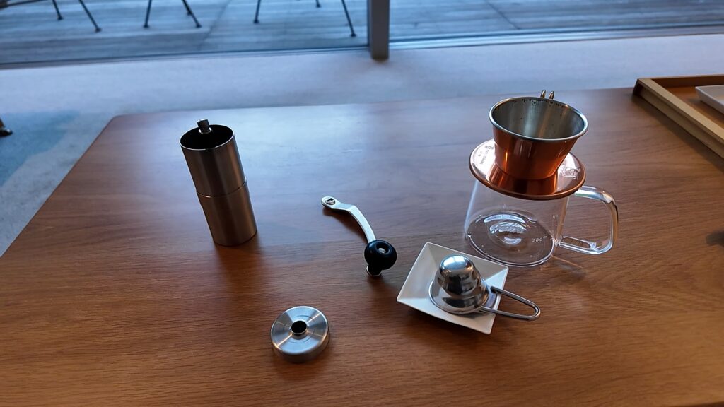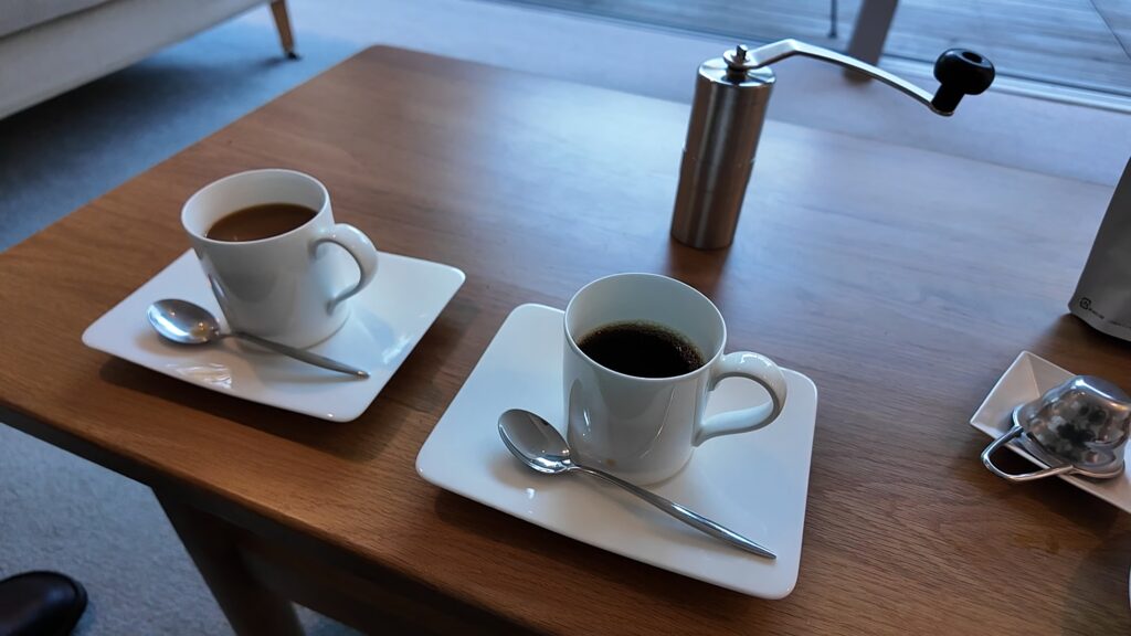 朝にコーヒーを飲みました。コーヒー豆をミルで挽いていただきます。コーヒー豆はホテルセレクションです。