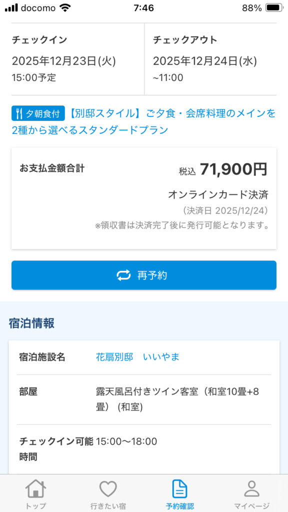 今回の料金。1泊2食付き 2名