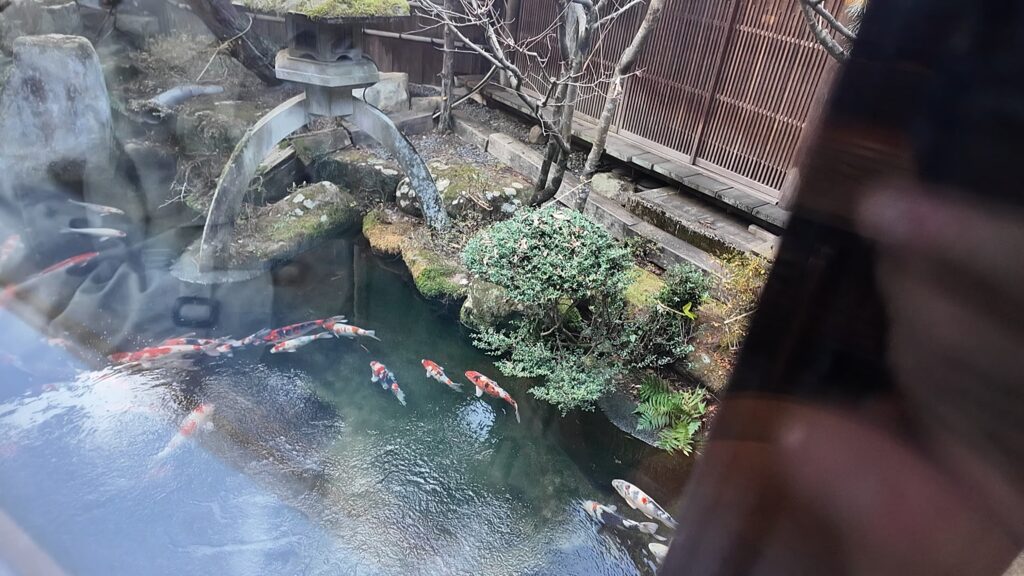 中庭に見える池にはまんまるとした錦鯉が泳いでいて和の雰囲気を感じます。