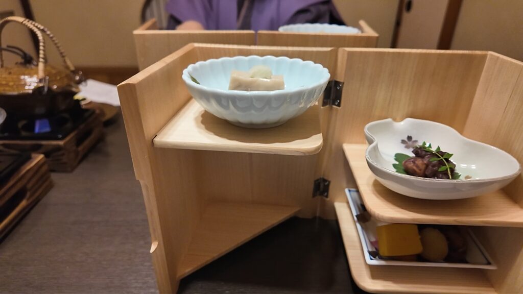 前菜は3段です。上段の胡麻豆腐 二段は烏賊小倉煮 三段は錦玉子 カステラ南瓜 子持鮎有馬煮 八ツ橋牛蒡