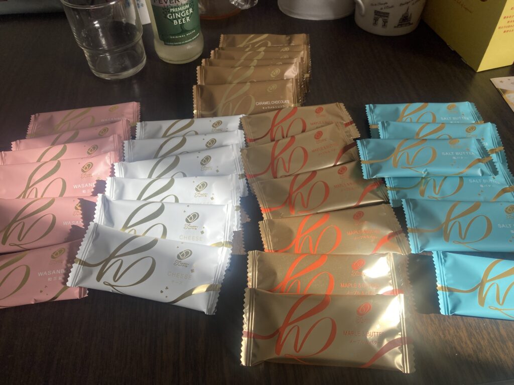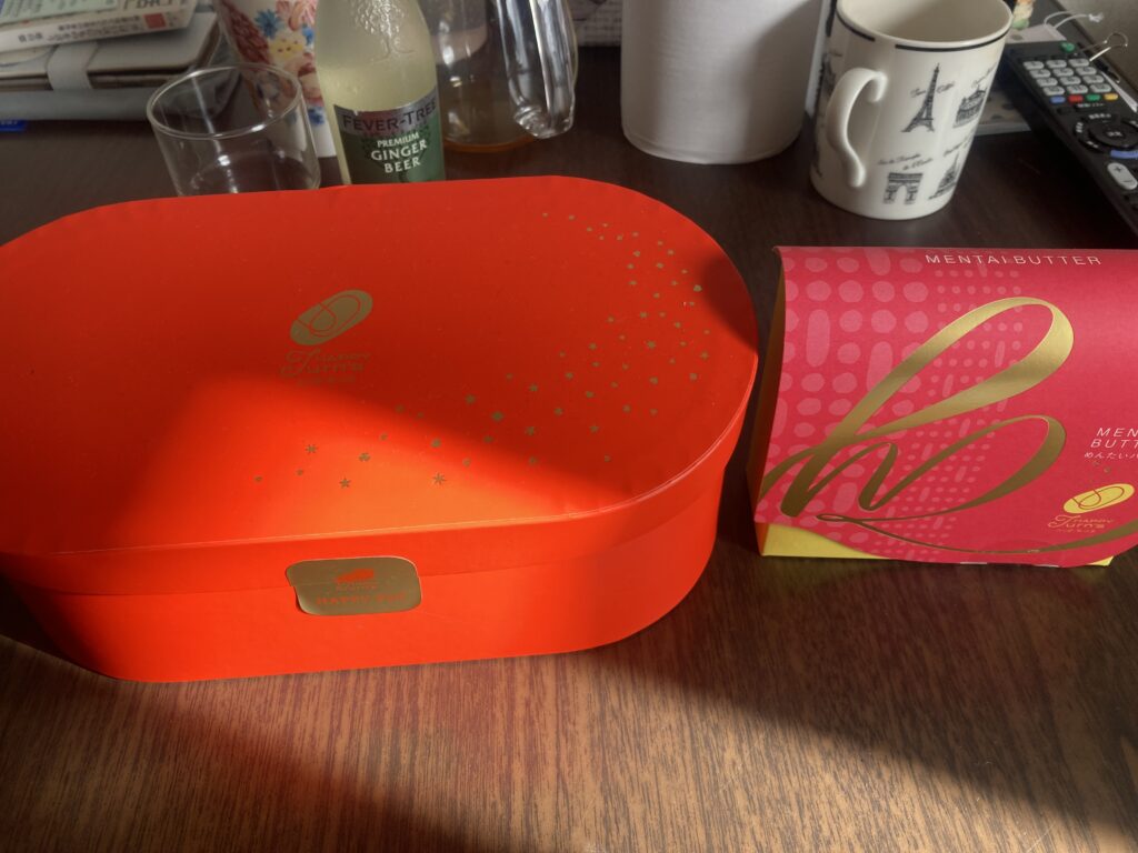 早速家に帰っていただきました。鮮やかな赤い箱に入っていて小物入れなどに再利用できそうです。それと博多阪急限定のめんたいバターのBOXです。