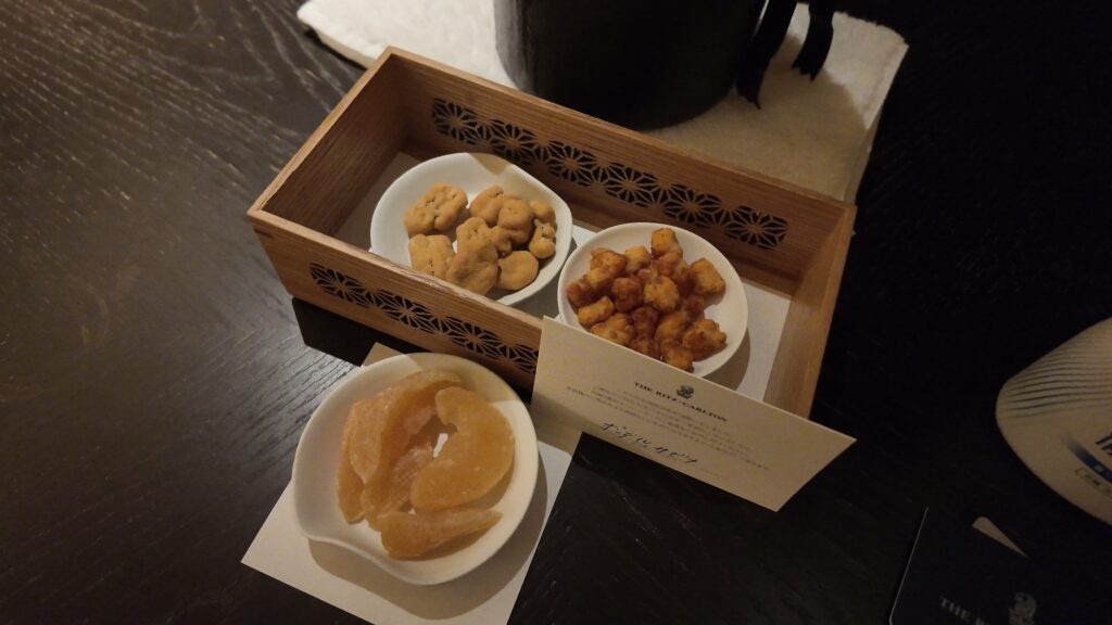 お部屋に戻るとターンダウンサービスになっていてお水やおつまみが用意されていました。
