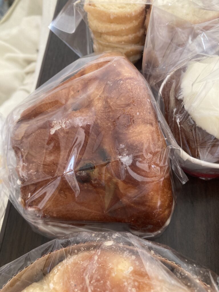 レーズンとフルーツの砂糖付が入っていて外枠のコーティングの食感が美味しいパンです。